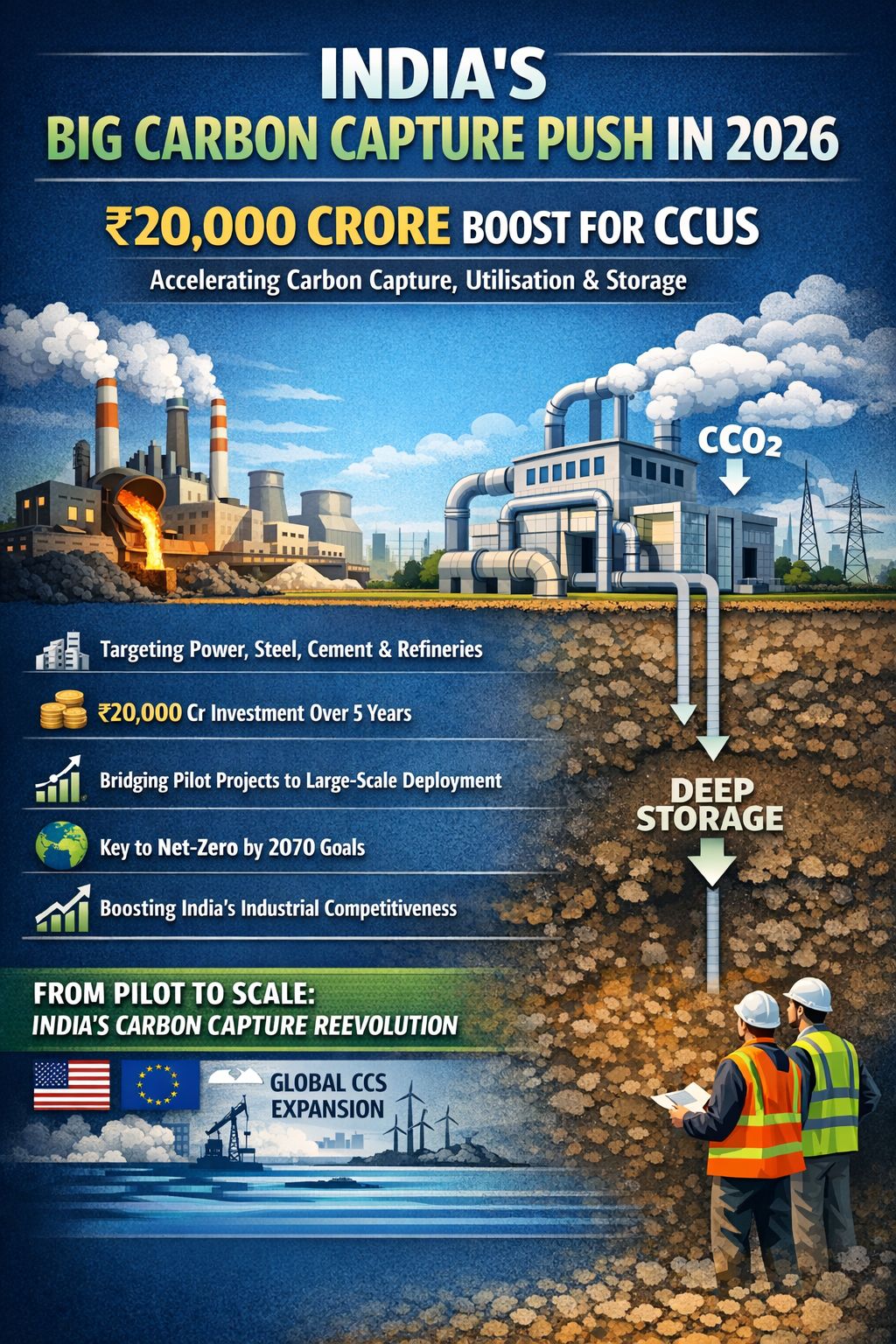 1) In the Union Budget 2026-27, the Government of India made a bold climate move by allocating ₹20,000 crore (about $2.2–2.4 billion) over five years to accelerate Carbon Capture, Utilisation and Storage (CCUS) technologies.