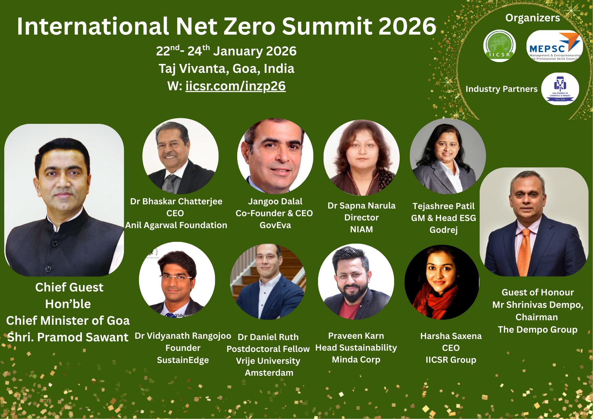 Join the International Net Zero Summit 2026 — the global meeting ground for sustainability visionaries, innovators, and policymakers — from 22–24 January 2026 at Taj Vivanta, Goa. Hosted by IICSR Group in collaboration with MEPSC (Ministry of Skill Development & Entrepreneurship, Govt. of India) and Goa Chamber of Commerce & Industry (GCCI), the summit is often called the Davos of Sustainability and Net Zero Goals.